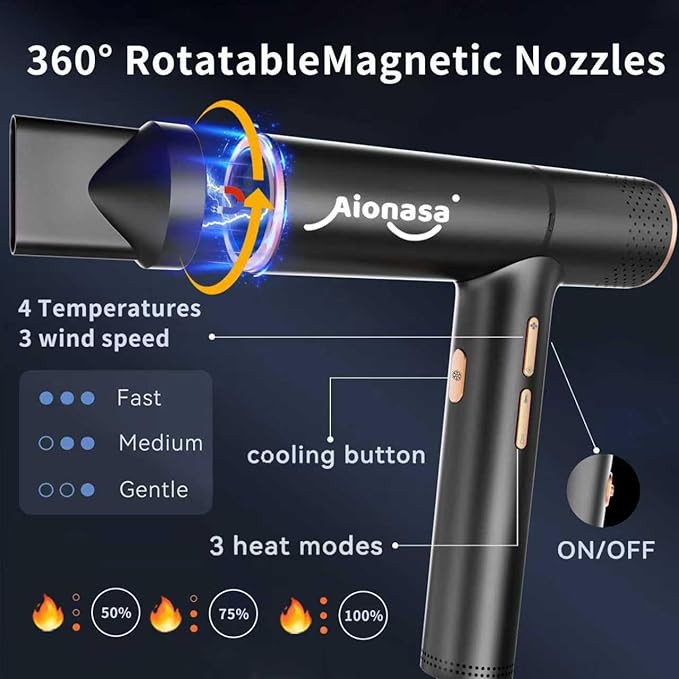 - 【 Compact & Portable& Low noise】 : With a strong magnetic nozzle that does not fall off,easy to acttach it on. Make you more confident, convenient and super easy to use!. The noise level of the hair dryer is under 55 dB,no worry about noise. Travel is made easy by the little dryer's portability and lightweigh as weighs 300g/10.58oz