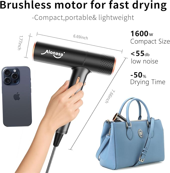 Hair Dryer, High Speed Ionic Blow Dryer with Brushless Motor for Fast Drying, Lightweight, Low Noise Compact Hair Blow Dryer, Hairdryer with 1 Magnetic Nozzle Attachments for Salon Home Travel
