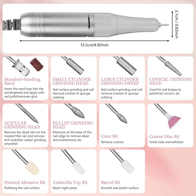 - All-in-One Professional Kit for Every Nail Need: Outfit your toolkit with 11 premium drill bits and 51 sanding bands—the most versatile collection for acrylics, gels, cuticles, calluses, and natural nails. From delicate detailing to heavy-duty shaping, this kit handles it all. The built-in storage base keeps accessories organized and within reach, turning chaotic workspaces into tidy, efficient stations. Perfect for pros who demand variety and beginners learning the ropes.