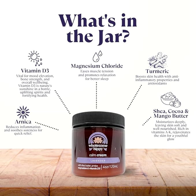 WHOLESOME HIPPY Calm Body Cream with Magnesium, Arnica & Vitamin D3 – Lavender Scented – Nourishing Botanical Moisturizer with Shea, Turmeric & Aloe – 4oz
