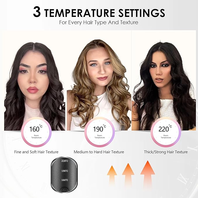 - 【3 Temps Customizable Heat Settings】 This curling iron offers three adjustable temperatures (160°C/190°C/220°C) for precise thermal control and quick 10-second heating.It is suitable for all hair types. The suitable temperature for fine and soft hair texture is 160℃, for medium to hard hair texture is 190℃, and for thick hair texture is 220℃. The built-in beep alert ensures precise timing for each curl.