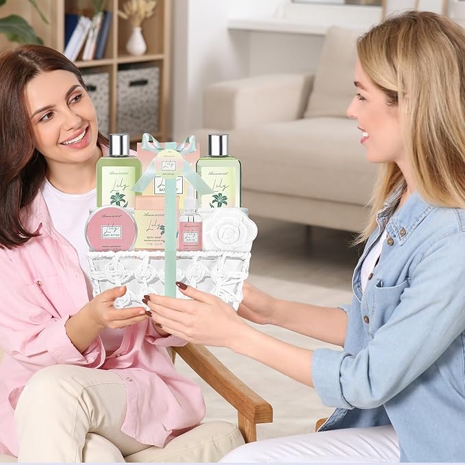Spa Gift Baskets for Women Bath and Body Gift Set, 9pcs Spa Gifts for Women, Lily Bath Gift Set with Bubble Bath, Body Lotion, Christmas Gifts for Her Relaxing Bath Sets