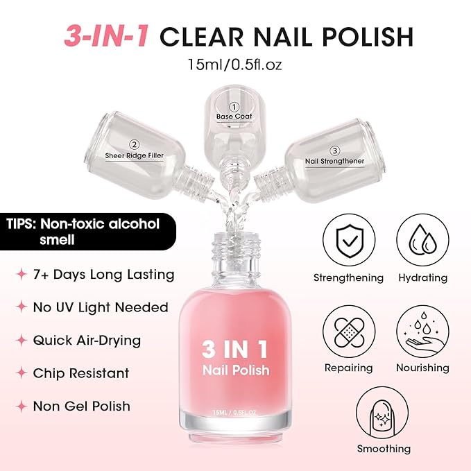 - Model Name : 3-In-1 Clear Nail Polish, Nail Ridge Filler, Nail Corrector Base Coat, Nail Strengthener and Growth Prevents Breakage, Tinted Pink Enhances Natural Look 3-In-1 Clear Nail Polish, Nail Ridge Filler, Nail Corrector Base Coat, Nail Strengthener and Growth Prevents Breakage, Tinted Pink Enhances Natural Look