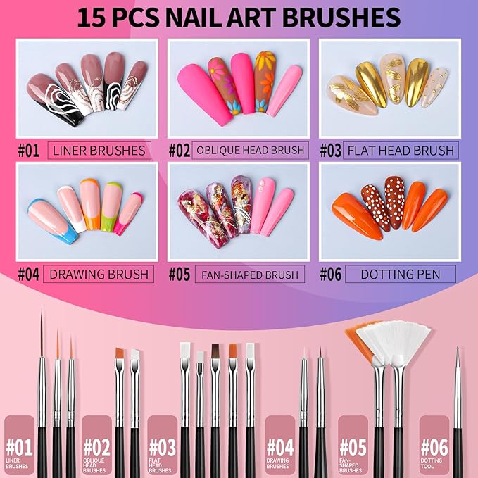 - Multi-type Acrylic Nail Brush: The nail brushes kit includes 15 pieces nail art brushes of varied size and shape, so you have the right brush at hand for every situation. The nail brushes for nail art are made from acrylic and fine, light nylon fiber. These comprehensive brush head fit for creating various decorations and paintings on nail. Great nail design tools for professional nail salons and nail art DIY at home.
