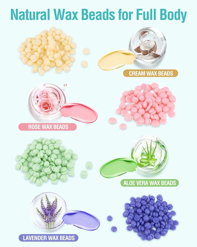 - 100% Natural Wax Beads: This hard wax kit is an excellent home waxing kit for women and men. It comes with a variety of wax beads, including cream, rose, aloe vera, and lavender. Made with natural ingredients, these wax beads offer effective hair removal while nourishing your skin for a smooth, irritation-free experience. Enjoy silky, hair-free skin without an expensive salon