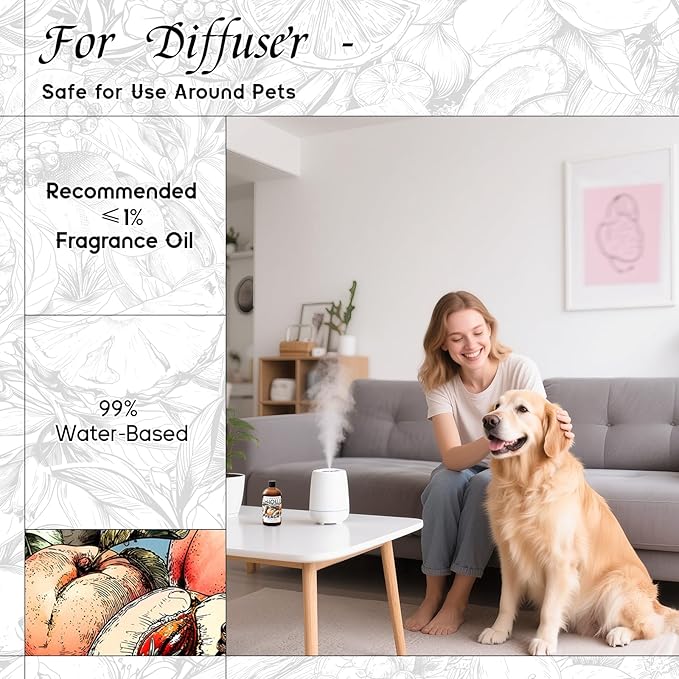 - Excellent Diffusibility: Just a few drops in a diffuser or humidifier, the wonderful peach scent will quickly and evenly permeate the room, leaving your living room, office or bedroom with a long-lasting pleasant aroma