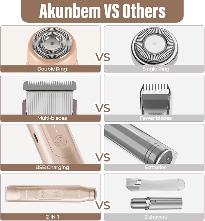 - Versatile Grooming Kit: Akunbem women electric shaver features an innovative dual head design that combines the functions of a body and facial shaver in one. There is no need to change the cutter head frequently. It can accurately and smoothly remove hair from the face, body and sensitive areas.