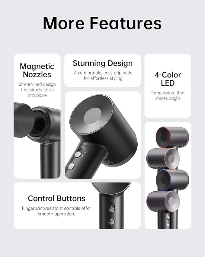 - 【Thermo Control Technology】Laifen's exclusive technology compensates excessive heat to avoid hair damage. The Thermo-Control microprocessor monitors the air temperature 100 times/s and makes adjustments to avoid your hair from being damaged by heat.