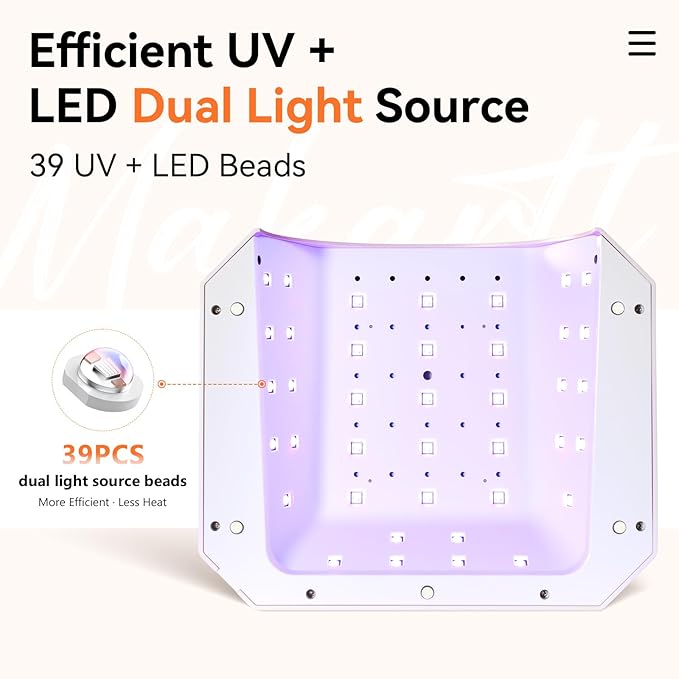 - 39 LEDs & Effective 30W Power Output: Now equipped with 39 evenly distributed UV/LED beads, this 30W gel nail lamp delivers powerful and uniform curing. Its optimized irradiance is equivalent to a 54W CCFL lamp, curing gel polish faster and more evenly than standard lamps.