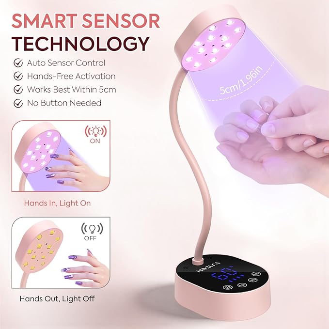 - Smart Sensor & Touch Timer Control: Auto sensor turns the LED lamp on/off when your hand enters or exits. Touch control offers 10s/30s/45s/60s timers, with 45s as the default setting when powered on. The built-in LCD clearly displays curing time and battery status.
