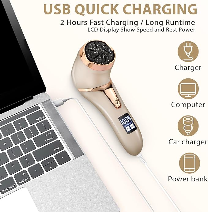 - Rechargeable, Long-Lasting, Easy to Use ----Included USB charging cable, This electric foot file can be charged via any USB port, and have a long runtime 2hours after full charged .and this dead skin remover for feet have LCD Power display let you clear know the rest power it left. remind you charge in time