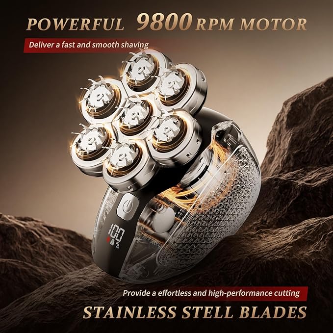 - 7D Floating Shaving System: Designed with seven independently floating razor heads, this shaver automatically adjusts to every curve of your face, neck, and head, delivering a consistently close yet gentle shave with. Driven by a high-performance 9,800 RPM motor, it provides strong and stable cutting power to efficiently capture more hair in a single pass, significantly reducing repeated strokes and saving time. Whether you’re shaving flat surfaces or tricky contours, each head maintains perfect skin contact for a faster, smoother, and more comfortable shaving experience.