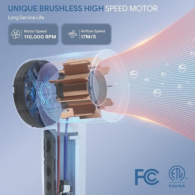 - High-Speed Motor for Fast Drying: Equipped with a powerful 110,000 RPM brushless motor and an enhanced duct design, the Labiim professional hair dryer delivers swift airflow at 17m/s—five times faster than traditional hairdryers.
