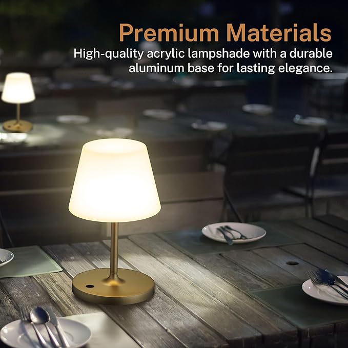 • LONG-LASTING BATTERY & POWER BANK: Equipped with a 5000mAh rechargeable battery, this Cordless lamps delivers approximately 16 to 24 hours of lighting per full charge. The durable aluminum alloy body and IP44 waterproof rating stand up to indoor and outdoor use rain or shine. Built-in USB-A output lets it double as a power bank so you can charge phones, tablets, earbuds, and other small devices even while the waterproof lamp is on.
