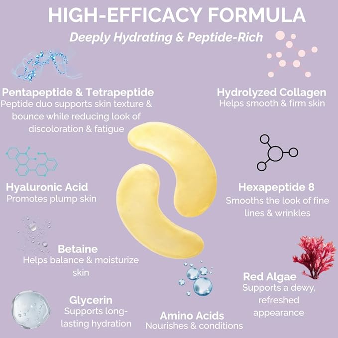 - HYDRATING FORMULA FOR SMOOTHER LOOKING SKIN: Under eye mask patches are infused with Hyaluronic Acid, Collagen, and Betaine to deeply hydrate, improve softness, and leave the delicate under-eye area looking smooth, plump, and refreshed.