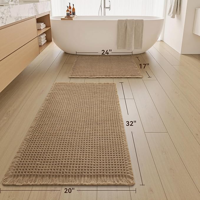 Upgraded Waffle Bath Mat Set of 2, Super Absorbent Non Slip Bath Mats for Bathroom Floor, Machine Washable Boho Bathroom Rugs Set 2 Piece with Tassels, Soft Bathroom Mat Set, 17" x 24" +20" x 32"