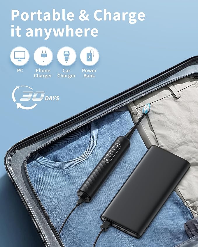 - 【Waterproof & Rechargeable】: The electric toothbrush with IPX7 is waterproof design inside and outside, providing dual protection to prevent water leaks and you can use it in the shower. This rechargeable oral irrigator with a powerful 1100mAh lithium battery, which can last for 30 days once fully charged, making it an ideal choice for both travel and home use