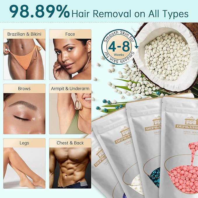 - DIY Salon Results for Beginners at Home: Follow the Lifestance quick guide to easily get 98.89% hair removal at home—even if you’re new. Our kit works for all hair types & areas (brazilian, bikini line, face, brows, underarms, legs, back, full body). Plus, our high-quality wax beads deliver smooth, hairless skin for 4-8 weeks, matching the results of professional salon treatments right at home