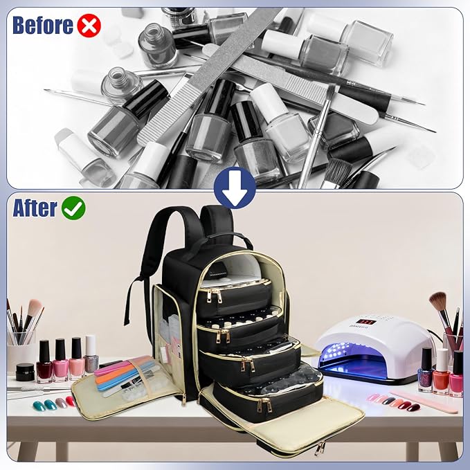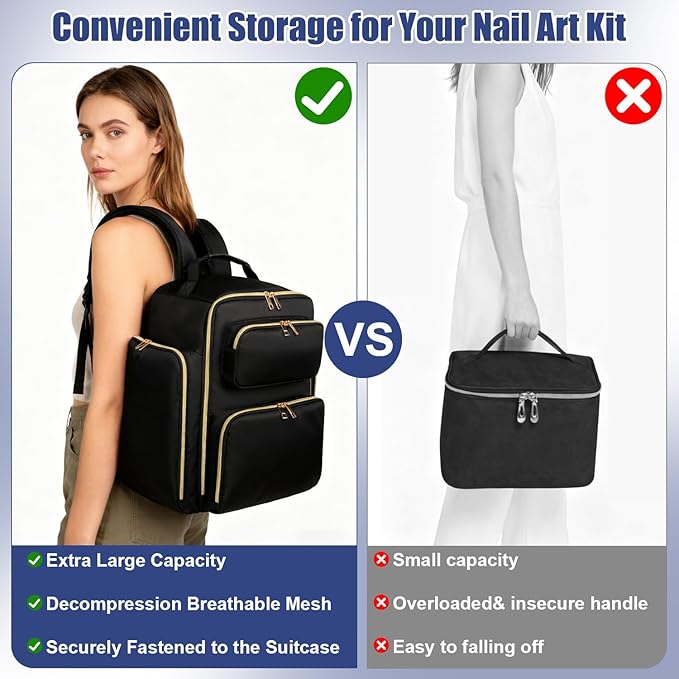 - 【Ergonomic& Comfortable to Carry】The adjustable shoulder straps are padded with breathable mesh to effectively distribute weight and reduce shoulder pressure during travel. For added convenience, the nail travel backpack also features a top PU leather carry handle and a dedicated luggage strap on the back, allowing you to securely slide it over your suitcase handle for effortless mobility.