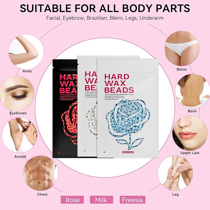 - 2. Full Set for All Uses:Comes with 6 wax bead bags (lasts long), 10 pre-wax wipes (cleans skin, helps wax stick better), 10 post-wax wipes (removes leftover wax, calms skin), and 10 tools for easy, precise use.