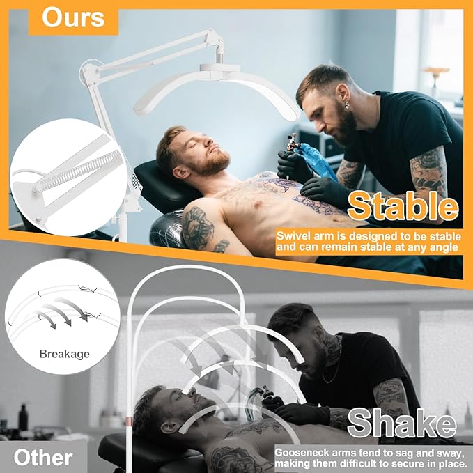 - 【Upgraded Lamp Arm & Adjustable Height 】This LED tattoo light features a new rotating arm design, replacing the traditional style, for working more stable. The arm adjusts from 47" to 71.65" by loosening and tightening the rose gold adjustment ring, allowing comfortable height, whether sitting or standing.