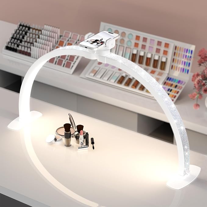 - 【Innovative Foldable Design】 - Our half moon light for nail desk with mobile phone holder offers convenient portability and can be folded in the gift storage bag in just two steps, the base can be effortlessly attached and detached, eliminating the need for complicated screw installation. Convenient to your nail art and sharing social media creations anytime.