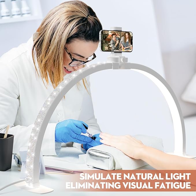 - 【Multi-purpose】- The professional half moon led light is not only suitable for nail techs, skincare, tattoos, also suitable for daily lighting for reading, painting, photography, threading, crafting, online teaching and more. Provide comfortable ambient lighting for your high-quality precision work.(The product does not include a mobile phone)