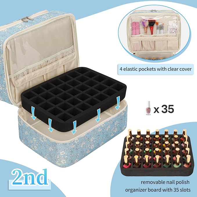 - Double Layer Design: This nail polish storage bag features a unique double-layer design, with the upper layer including a 10-slot nail polish organizer board, a large mesh zipper pocket and an adjustable velcro divider that can accommodate nail lamps of different sizes. The lower layer can hold 35 bottles of nail polish and 4 elastic pockets for nail tools