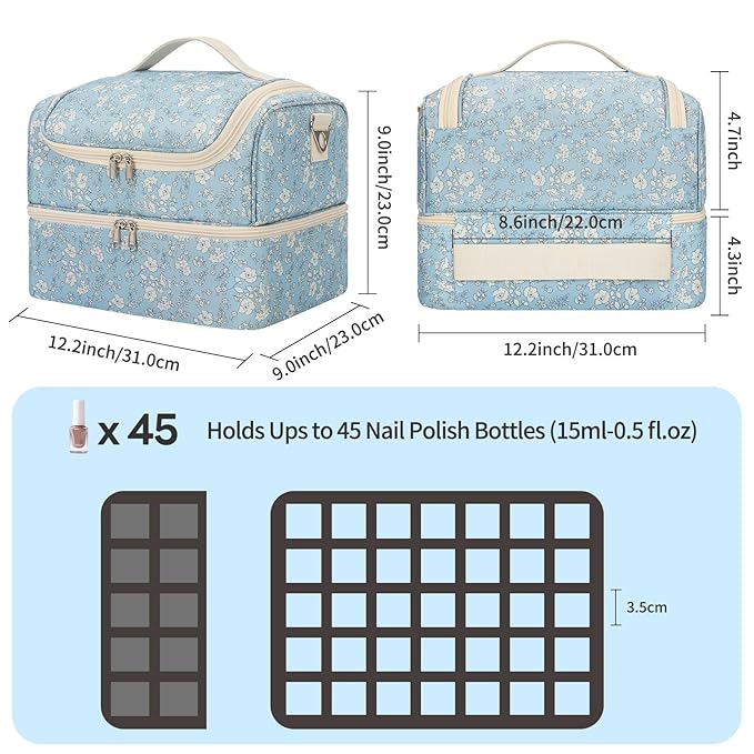 - Large Capacity: This nail organizers and storage case can hold up to 45 nail polish bottles, a led nail lamp, nail drills, and other manicure tools, keeping your manicure set neat and organized. The bag measures 12.2"×9"×9"