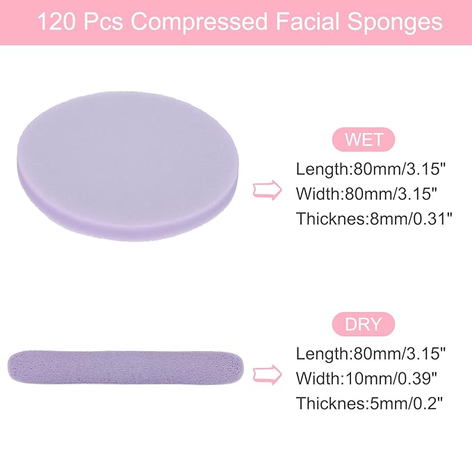 - Quantity and Shape: The package includes 120 counts of round compressed facial sponges, each sponge pad measures approx 3.15 inches/ 80 mm in diameter, compressed thickness of 5mm, and can become 8 mm/ 0.3 inches thick after absorbing water.