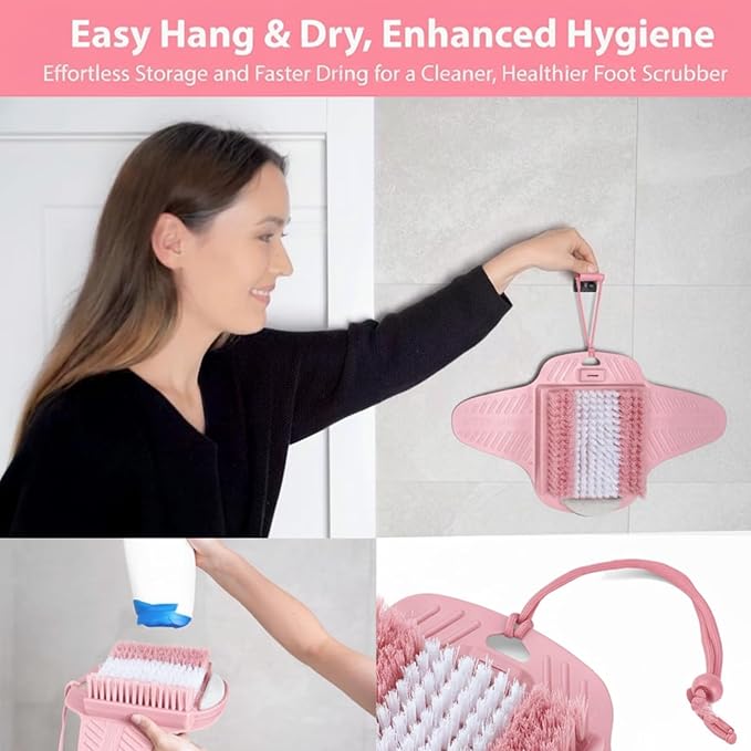 - Considerate Design with Built-In Hook & Non-Slip - Experience ultimate safety and durability with this feet callus remover. The strong suction cups and anti-slip base ensure a secure grip on any surface, while the side flaps help you maintain balance during use. With its sturdy bristles, this exfoliator will keep your feet clean and healthy for a long time. The built-in hook enables easy drying and convenient storage.