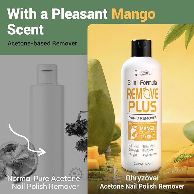- Nourishing Mango Seed Oil Infusion: Unlike harsh 100% acetone removers that strip nails of moisture, ours is enriched with mango seed oil to provide deep nourishment. It reduces the risk of dry, brittle nails and rough cuticles, so your nails stay healthy and looking their best even after removal. Pro tip: Shake the bottle before use to ensure the mango seed oil mixes evenly, maximizing its moisturizing benefits.