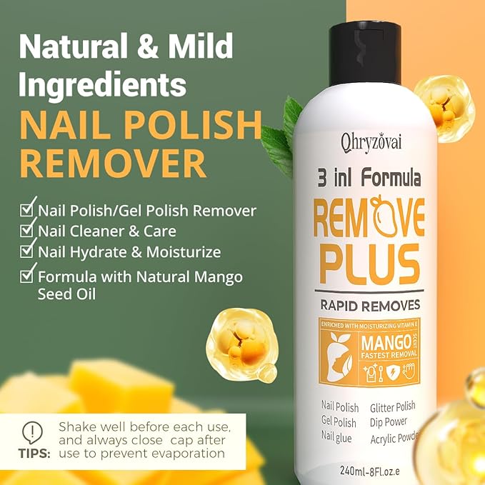 - Triple-Action 3-in-1 Nail Care Solution You’ll Love: Meet your new go-to for effortless nail removal: our 3-in-1 Nail Polish Remover, designed to simplify your manicure routine while caring for your nails. It comes with a convenient flip-top cap that locks in freshness—say goodbye to evaporation and messy spills! Whether you’re tackling gel polish, acrylics, dip powder, UV/glue, or poly gel, this remover works fast to dissolve 99% of nail products, all while being infused with mango seed oil to keep nails clean, shiny, and never dried out.