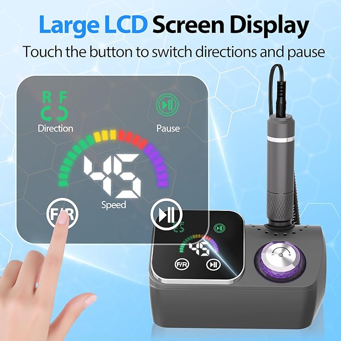 - Effortless Control for Beginners & Pros: The PYVOLA drill for nails features a large LCD screen that displays real-time speed (0-45,000 RPM) and the R/F dual rotating direction. An extra pause function allows for easy bit changes without shutting off the electric nail filer. Simply turn the crystal knob to begin your salon-grade manicure, making flawless results achievable for everyone