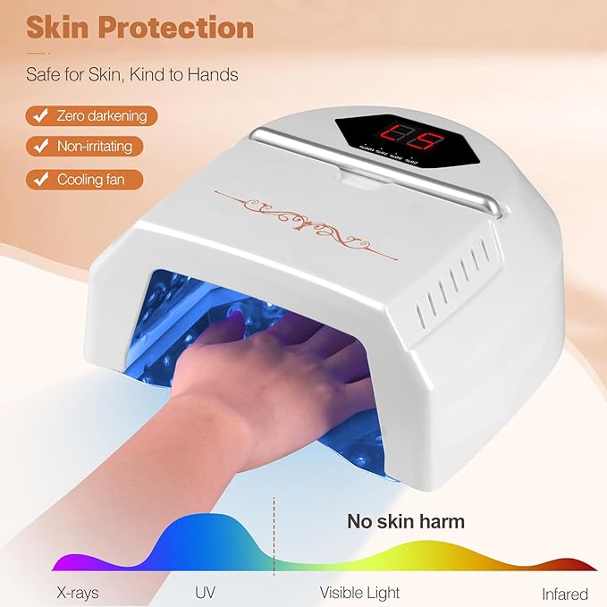 - 【Idea for Salon and Home DIY Use】 Our nail polish curing lamp is professional salon quality. It works well with all types of gel polishs, such as base coat gel, top coat gel, poly nail gel, builder nail gel, gem glue, resin gel, ect. It's suitable for salon and home DIY use.12-MONTH WORRY-FREE WARRANTY,if you have any questions, we will reply to you and solve the problem within 24 hours.