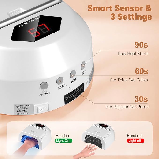 - 【Smart Sensor & 3-Timer setting】 The gel light for nails features an infrared motion sensor that automatically turns on when hands are inserted and shuts off when removed - completely hands-free. Upgraded gel uv light for nails design with 3 timer settings, including 30s,60s,90s allows for precise and customizable curing based on your specific needs and preferences.