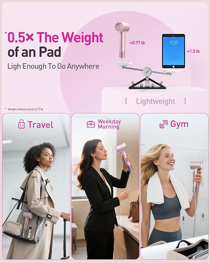 - 【No More Heavy and Noisy Drying: Only 59db & 0.77 lbs】 Our travel hair blow dryer is a portable dryer and ergonomically designed tool, weighing only 0.77 lbs. making it easy to handle during long drying sessions without straining your arm. Its compact size is only half that of traditional quiet hair dryer, making it easy to carry and perfect for travelling. Equipped with 10 layers of noise cancellation technology, it operates at a noise level below 59dB—quieter than the sound of cars passing by on the street. Quiet and efficient, it ensures you won’t disturb others while using it, whether at home, in a hotel, or on the go.