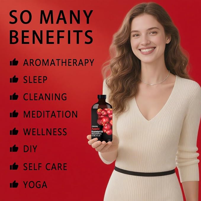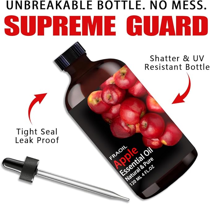 - Premium Apple Essential Oil: Enjoy the refreshing and soothing aroma of Apple Essential Oil, FRAOIL Apple Essential Oil is an upgraded and enhanced formula that has been sorted and bottled through a rigorous and standardized process to ensure the highest quality ingredients. Whether you use it for home aromatherapy or perfumery, this Apple essential oil will bring you a relaxing atmosphere.