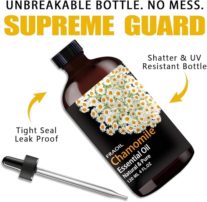 - Premium Chamomile Essential Oil: Enjoy the refreshing and soothing aroma of Chamomile Essential Oil, FRAOIL Chamomile Essential Oil is an upgraded and enhanced formula that has been sorted and bottled through a rigorous and standardized process to ensure the highest quality ingredients. Whether you use it for home aromatherapy or perfumery, this Chamomile essential oil will bring you a relaxing atmosphere.