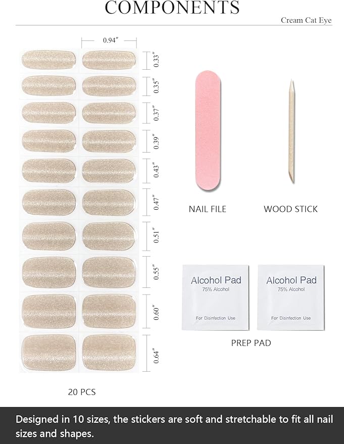 - 【Nail Art Stickers Set】- Each box comes with 20 gel nail strips in 10 different sizes for the perfect match. It also comes with 2 prep pads, 1 nail file, and 1 wooden stick.