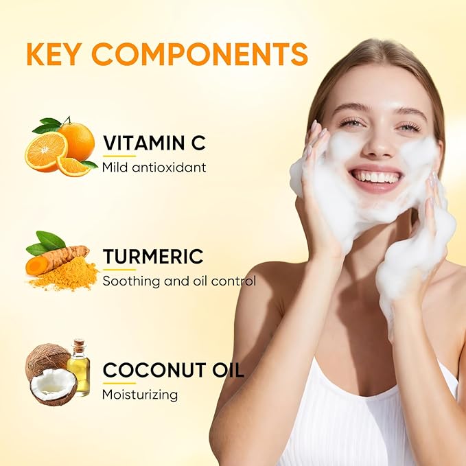 - 【MILD FORMULA】The Facial Cleanser enriched with turmeric and vitamin C. Turmeric, an ingredient known for its properties. Helps promote a balanced. With Vitamin C to help revitalize the look of your skin. This combination helps cleanse the skin and promote a refreshed, vibrant-looking appearance.