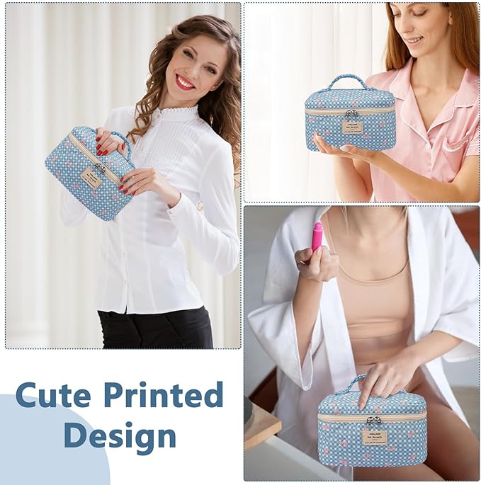 - ✅High-Quality Material: This travel cosmetic bag is made of cotton material, which is easy to clean, has been well- stitched and reinforced at all stress points. The double zipper is made of high-quality gold-plated alloy, which can make the makeup bag easier to pull and align neatly.