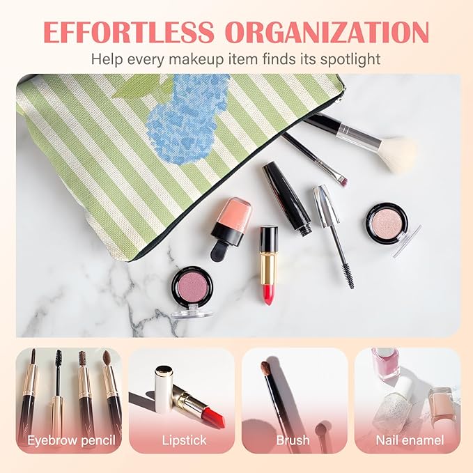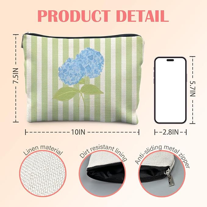 Blue Hydrangea Floral Makeup Bag for Women, Cottagecore Botanical Blue Flower Green Striped Cosmetic Bag for Purse, Floral Makeup Zipper Pouch