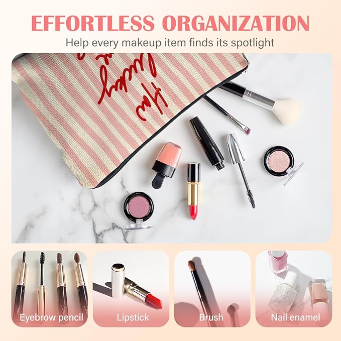 Retro Red Pink Striped Makeup Bag for Women, Positive Gifts for Women, How Lucky Are We Trendy Aesthetic Cosmetic Bag for Purse, Preppy Girly Makeup Zipper Pouch