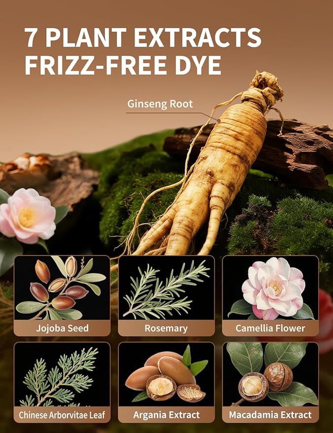- 3.No Frizz After Dyeing.The semi - permanent hair dye contains 7 natural plant extracts, such as ginseng root, camellia flower, and rosemary. The complete formula table is clearly visible. While dyeing your hair, it nourishes your hair, doesn't irritate your scalp, and effectively reduces hair frizz.