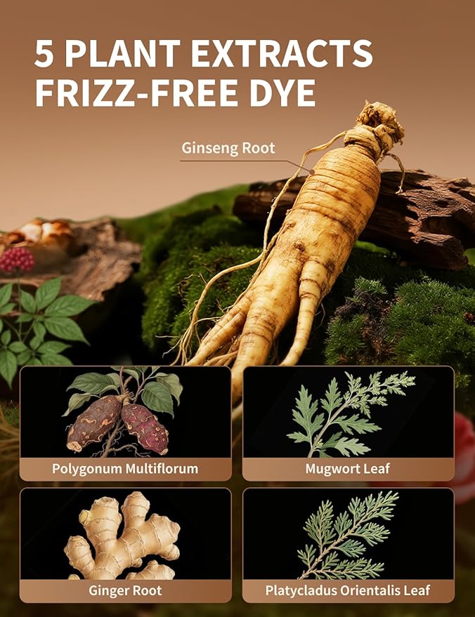 - 3.No Frizz After Dyeing.The semi - permanent hair dye contains 5 natural plant extracts, such as ginseng root, Polygonum multiflorum, and ginger. The complete formula table is clearly visible. While dyeing your hair, it nourishes your hair, doesn't irritate your scalp, and effectively reduces hair frizz.