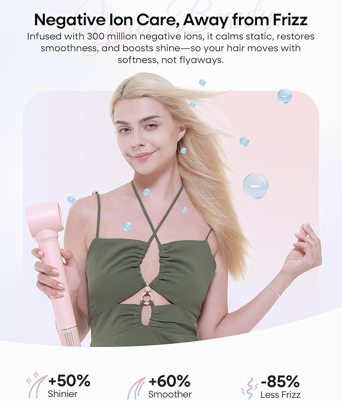 - 【Smart Temperature Control & Negative Ion Tech - Gentle Care, No Heat Damage】Features intelligent temperature control to dry hair quickly at lower heat, preventing damage caused by traditional hair dryer brush. Additionally, its 300 million high-concentration negative ions neutralize static, tame frizz, and reduce breakage — leaving hair smoother, shinier, and healthier.