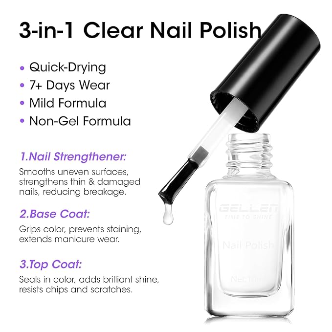 - 3-in-1 Base Coat, Top Coat & Nail Strengthener: Simplify your nail care routine with the innovative 3-in-1 base top coat strengthener: apply as a base coat to protect nails and prevent color peeling, use as a top coat to seal in color with a high-gloss shine, and use as a nail strengthener to smooth uneven surface and fortify brittle nails. This streamlined approach makes achieving a salon-quality manicure quicker and easier than ever before.