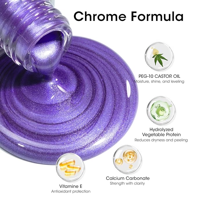 - Dazzling Mirror Chrome Nail Polish Kit: This kit includes dark purple & blue mirror chrome nail polish with 3-in-1 clear nail polish. The fingernail metallic holographic nail polish under different lighting can create a dazzling, multi-dimensional metallic finish, a perfect statement nail polish for parties, festivals, or adding a touch of magic to your everyday style. It is a perfect gift for Halloween, Thanksgiving, Christmas, New Year's Eve, Valentine's Day or birthdays!