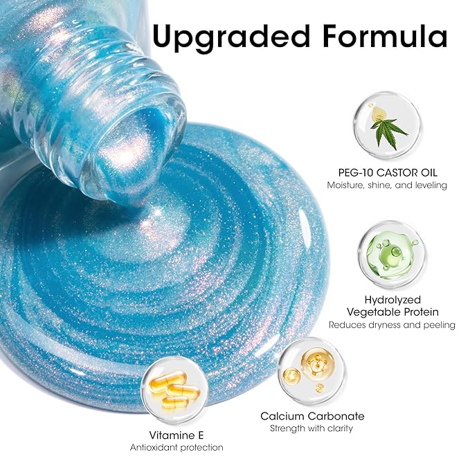 - Nourishing Core Ingredients for Shiny Nails: Our formula is non-gel formula, non-toxic, cruelty-free & vegan. Compared with traditional nail polish, it is enriched with key ingredients that care for your nails while delivering beautiful color. Enriched with PEG-10 Castor Oil for smoothness, Calcium Carbonate for strength, Hydrolyzed Wheat Protein to prevent peeling, and Vitamin E for protection.